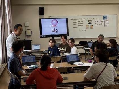 研修では、本校の教員が児童役となり、実際の授業を想定した模擬授業を通して学びを深めました。言語活動を中心としたアクティブな授業展開や、児童の意欲を引き出す指導法など、多くの学びがありました。