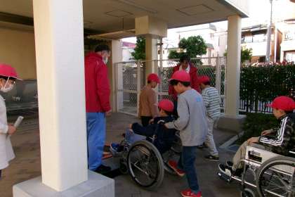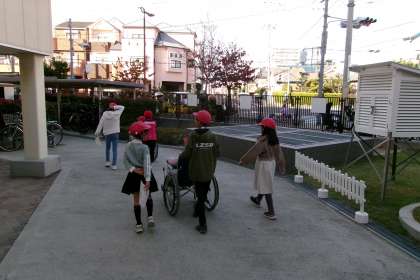 友だちを乗せて、車いす介助体験に挑戦しました。