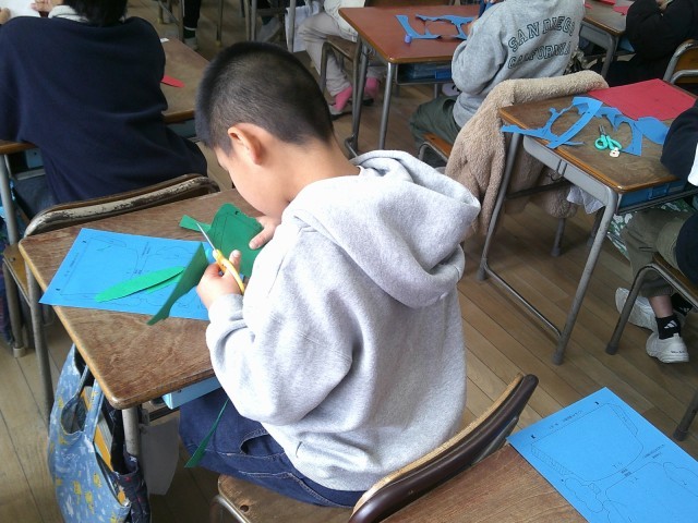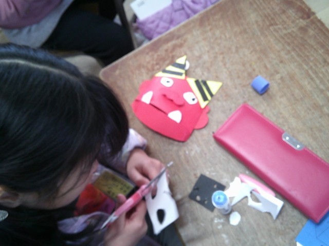 紙を切ったり貼ったりしながら、思い思いの表情の鬼を作っていました。