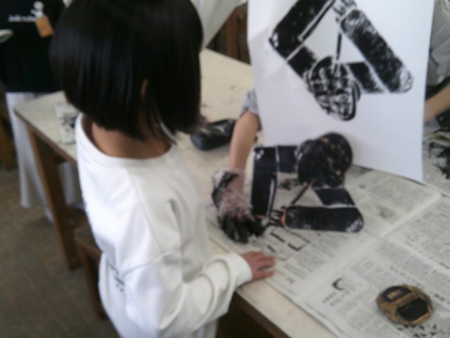 インクをつけ、バレンを使って刷る作業を行い、作品づくりを進めていました。
