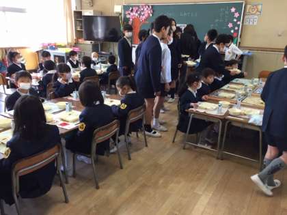 一年生は小学校での初めての給食でした。6年生が優しく配膳をお手伝いしてくれました。たっぷり食べて、「おかわりしたよ!」と嬉しそうに話していました。