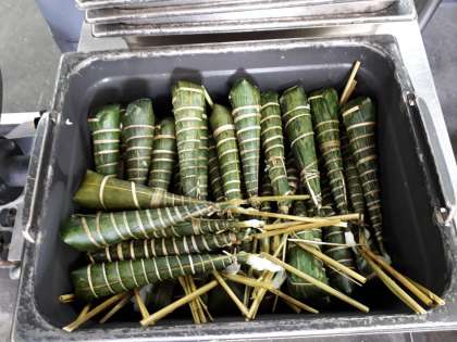 5月10日(金)の給食は子どもの日の行事献立で、牛肉のちらしずし、すまし汁とちまきでした。ちまきは焼き物機で蒸しました。