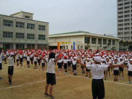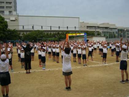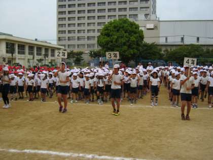9月19日 1時間目に初めての「全体練習」を行いました。先生方のお話をしっかり聞いて上手にできました。入退場門も設置されました。