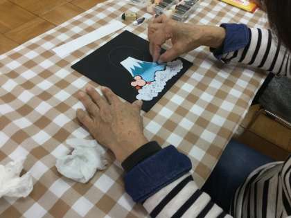 出前授業で講師にも来ていただいている安成先生が、正月や干支をモチーフにしチョークアートを教えておられました。参加した地域の方々は、お手本をしっかり見て描いたり、中には自分でアレンジを加えたりしながら、熱心に取り組まれていました。
