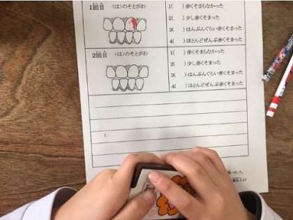 前歯の一本を赤く染めて歯垢を確認した後、教わった通りにして、きれいにみがき上げました。