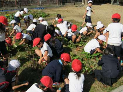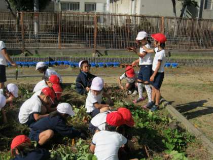 11月11日、4時間目に2年生がいもほりをしました。講堂の横の畑に移植ごてを持って行き、クラスごとに順番に掘りました。大きないもが、たくさん獲れて大喜びでした。収穫の成果は、写真のとおりです。