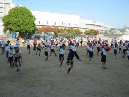 11月11日に低学年、12日に高学年の「なわとび朝会」を行い、さまざまな跳び方に挑戦しました。また運動場には「ジャンピングボード」も設置されて、休み時間には楽しく遊んでいます。各学級では長なわも使っていろいろな遊びを楽しんでいます。