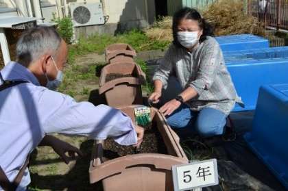「植物の発芽と成長」の学習で使用するために、ズッキーニの種を植えました。植物は、子孫を残すために様々な作戦を実行します。さて、ズッキーニはどんな方法で子孫を増やすのでしょうか?教科書にのっているインゲンマメも使います。楽しみにしていてくださいね。