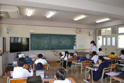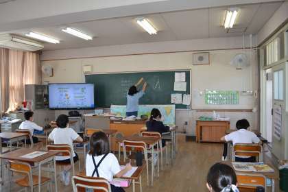 朝の会では、5年生になってやりたいことなどを話しました。課題の算数ドリルの学習を、電子黒板を使ってしっかり勉強しました。また、図工では学校ホームページを見て、だれが描いた絵か予想して楽しむこともできました。正解を発表すると、予想があたった子どもたちは大喜びでした。