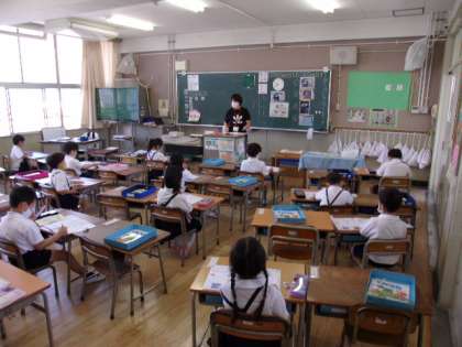 今日の1年生は、国語でひらがなの練習をしました。それから、6月から給食が始まるのでみんなで並んで給食室まで行きました。手洗いをしっかりするために、「手洗いカメさん」の動画も見ました。きれいな手洗い、がんばろうね!