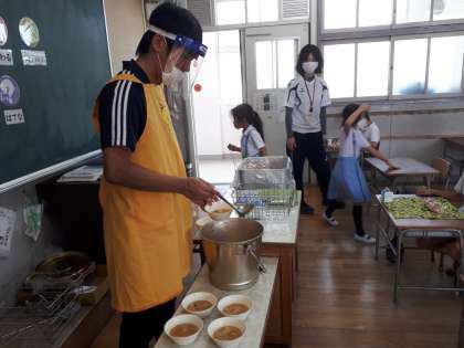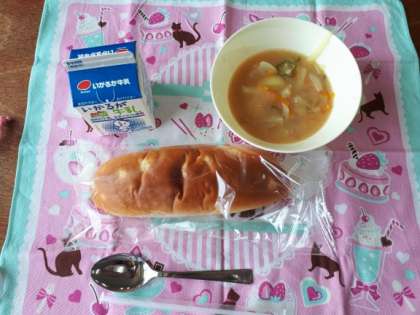 今日のメニューは、みそ汁・おさつパン・牛乳の三品でした。