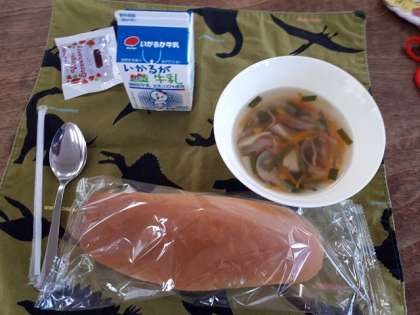 今日のメニューは、ハムと野菜の中華スープ・コッペパン(添加物:アプリコット)・牛乳の三品でした。