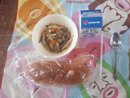 今日のメニューは、マーボーはるさめ・おさつパン・牛乳の三品でした。
