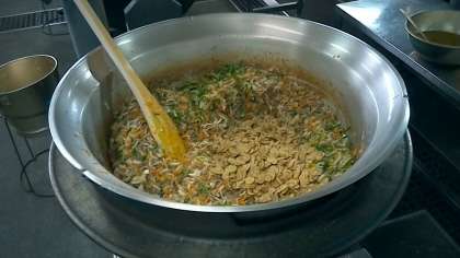 (具材を準備してミートソースを作り、最後に麺を入れて混ぜ合わせて、でき上がり!)