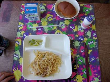 ♦ポークトマトスパゲッティ♦グリーンアスパラガスのサラダ♦発酵乳♦こくとうパン(小)♦牛乳
