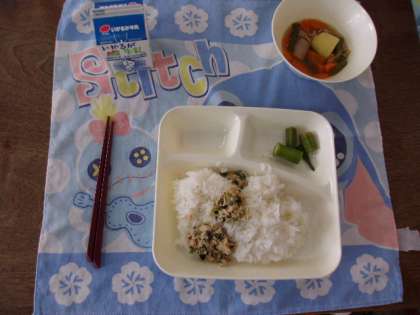♦豚肉とじゃがいもの煮もの♦オクラの梅風味♦ツナっ葉いため♦ごはん♦牛乳