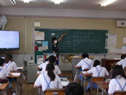 写真下 6年算数:整数や小数のときと同じように、分数のときも、次のような計算のきまりが成り立つかどうか調べよう。