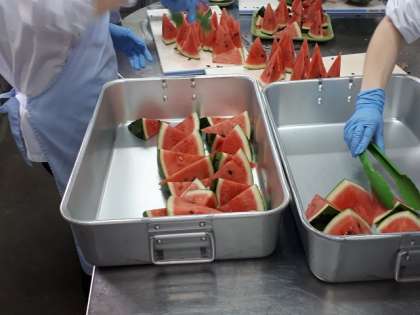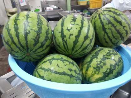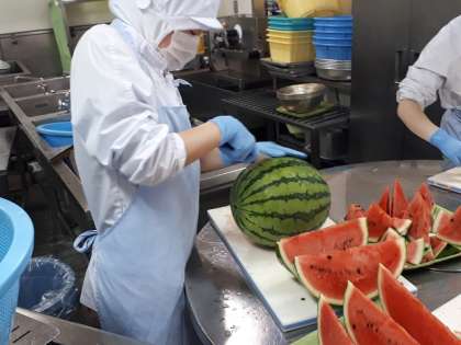 (1年に一度のスイカが出ました!Lサイズでした。一つ一つ、心を込めて切ってくださいました。)今日のスイカは鳥取県産でした。