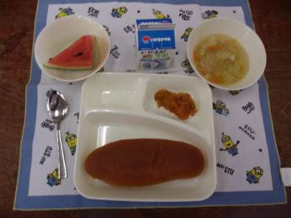 ♦かぼちゃのミートグラタン♦スープ♦すいか♦こくとうパン♦牛乳