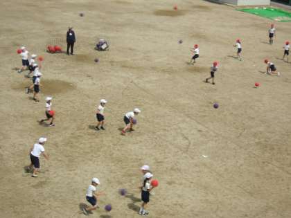写真下 3年体育:「ボールゲーム」〜相手の陣地にボールをたくさん投げ入れよう〜など。