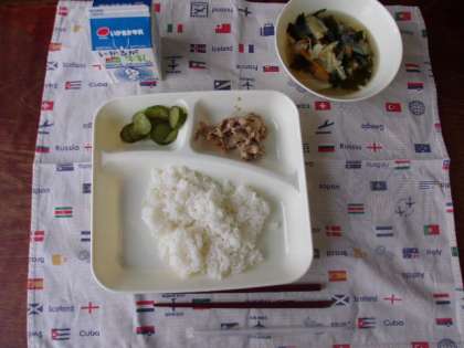 ♦豚肉のごまだれ焼き♦五目汁♦きゅうりのおかかあえ♦ごはん♦牛乳