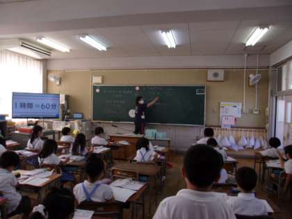 写真中 2年算数:1時間は60分であることを使って1時間10分は何分かを求める、など。