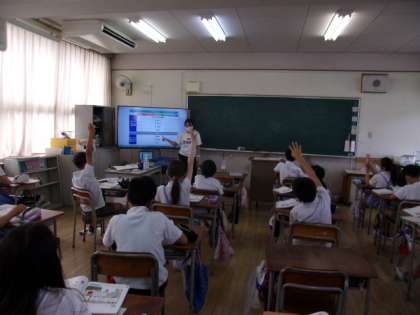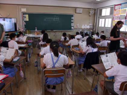 写真中 5年英語:ニックが水曜日の時間割について紹介します。音声を聞いて、聞こえてきたものを指でさしましょう、など。