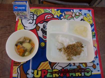 ♦鶏肉とじゃがいもの煮もの♦紅ざけそぼろ♦和なし(缶)♦ごはん♦牛乳