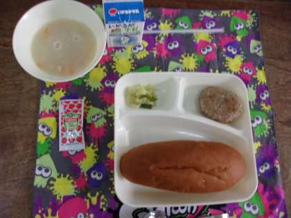 ♦焼きハンバーグ♦豆乳スープ♦キャベツとピーマンのソテー♦こくとうパン♦牛乳