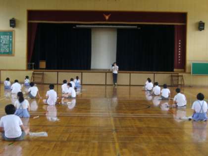 写真下 6年音楽:リコーダーの練習「メヌエット」(体育館で行いました。)