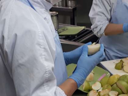 写真は、なし(二十世紀)を切った後、皮を全部きれいに剝いてくださっている様子です。