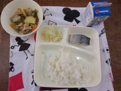 ♦さごしの塩焼き♦豚肉とじゃがいもの煮もの♦キャベツの梅風味♦ごはん♦牛乳