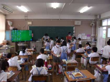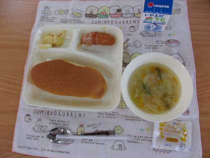 ♦フランクフルトのケチャップソース♦スープ♦焼きじゃが♦コッペパン(添加物:マーマレード)♦牛乳