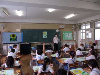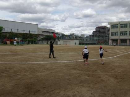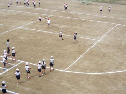写真下 3年体育:タグラグビーのボールをパスする練習、など。