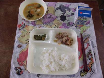 ♦豚肉の甘辛焼き♦みそ汁♦オクラのおかかいため♦ごはん♦牛乳
