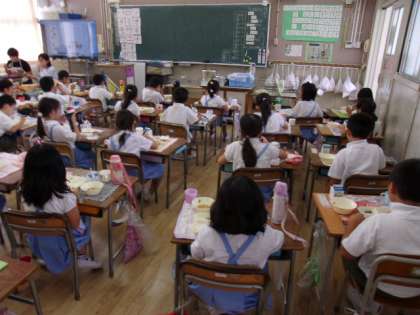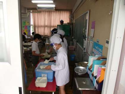 3 みそ汁やスープは具が沈んでいるので、底からよくかきまぜて配ろう。