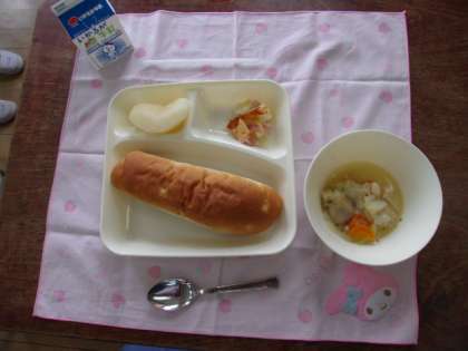 ♦鶏肉とてぼ豆のスープ煮♦じゃがいもとトマトのチーズ焼き♦なし(二十世紀)♦おさつパン♦牛乳