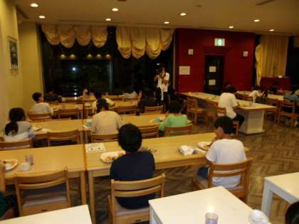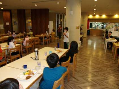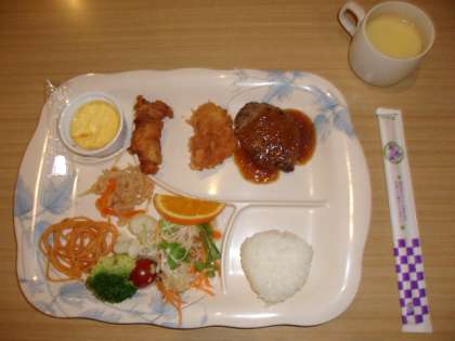 おいしかった! ハンバーグ、鶏肉のから揚げ、スパゲッティ、おにぎり(ごはん)、コーンスープは、お代わりできました。