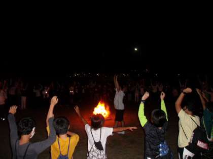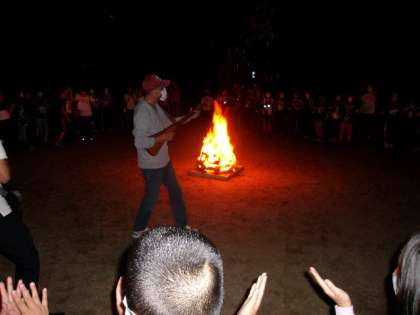 キャンプファイヤー指導員の方に進行していただきました。学生ボランティアの方も3名参加され、大いに盛りあげてくださいました。