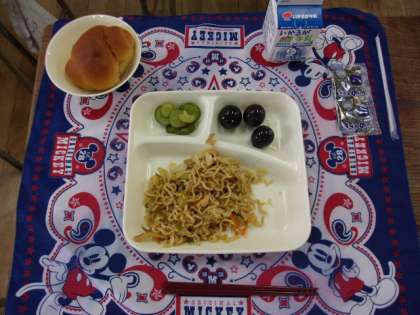 ♦焼きそば♦きゅうりのしょうがづけ♦ぶどう(巨峰)♦こくとうパン(小)♦牛乳