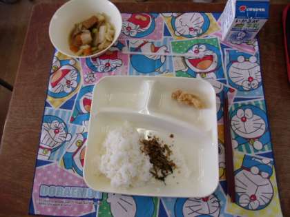 ♦鶏肉のたつたあげ♦あつあげと野菜の煮もの♦おかかなっ葉♦ごはん♦牛乳