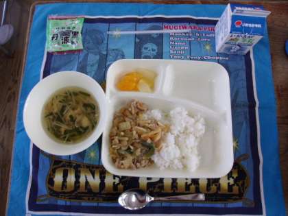 ♦ピリ辛丼♦中華スープ♦ソフト黒豆♦ミックスフルーツ(缶)♦牛乳
