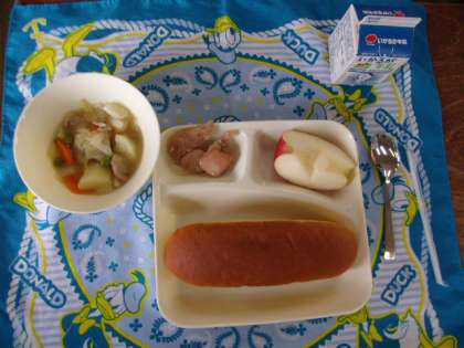 ♦鶏肉のガーリック焼き♦豚肉と野菜のスープ煮♦りんご♦パンプキンパン♦牛乳