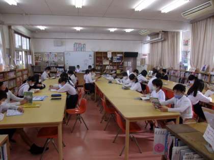 写真下 6年国語:図書館での読書活動。