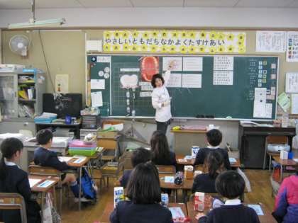 1月20日、歯科衛生士の先生に来ていただき、2年生の歯みがき教室を行いました。初めに歯に関するお話を聞いたあと、薬を使って歯垢の染め出しをしました。普段よく磨けていないところを確かめてから、正しい歯の磨き方を教えていただきました。