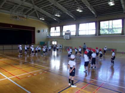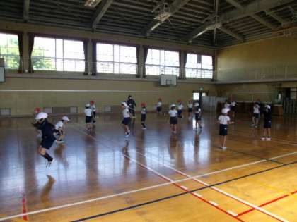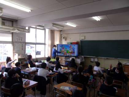 写真下 3年英語:教科書P.26〜「Unit7 This is for you.」絵の中にある〇、◇、♡、△、□の形を英語で言う、など。