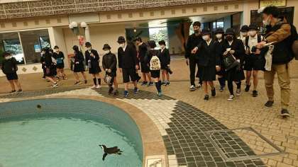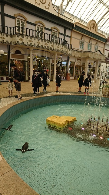 会場内の散策が始まっています。かわいいペンギンを、楽しそうに眺めています。