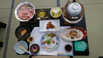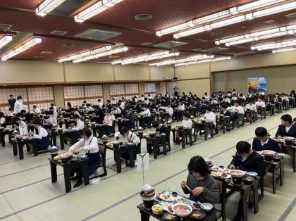 午後6時半ごろ、豪華な夕食の様子です。広い会場で、十分にスペースをとっていただいています。