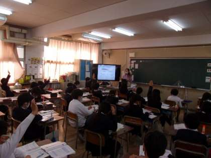 写真上 4年算数:「いろいろな分数」〜分数を仲間にわけよう〜真分数…分子が分母より小さい分数。仮分数…分子が分母と同じか、分子が分母より大きい分数。帯分数…整数と真分数をあわせた分数。