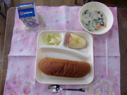 ♦きのこのクリームシチュー♦キャベツのピクルス♦りんご♦こくとうパン♦牛乳